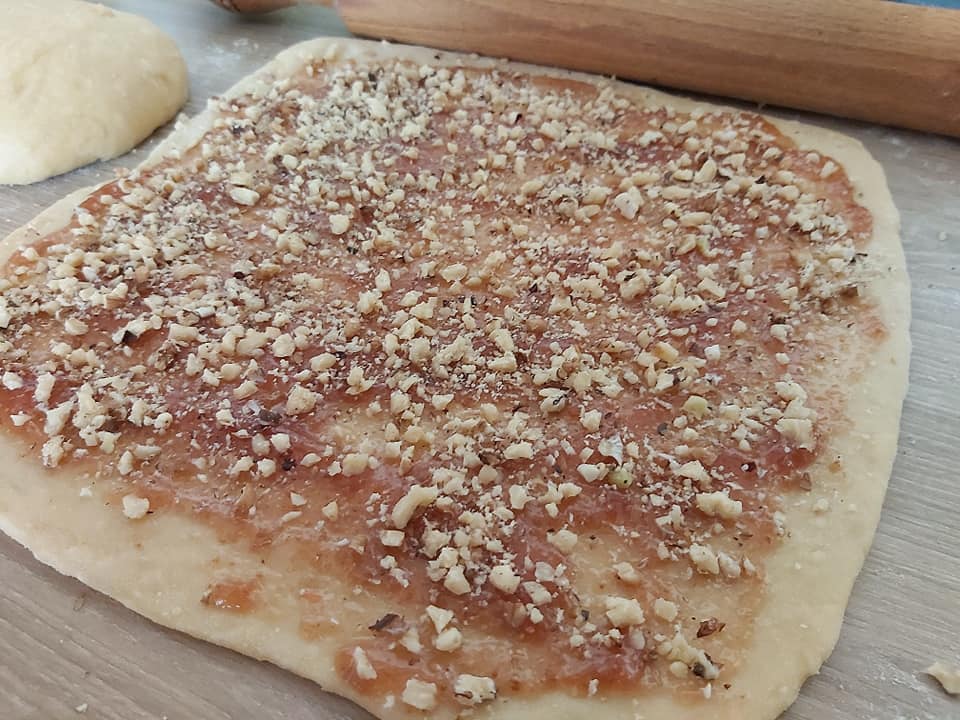 Μόλις γίνει αυτό, η ζύμη χωρίζεται σε δύο μέρη. Ένα μέρος είναι μικρότερο, το ανοιγουμε σε ορθογώνιο, αλείφεται με μαρμελάδα. Πασπαλίστε τα καρύδια πάνω από τη μαρμελάδα και τυλίξτε.