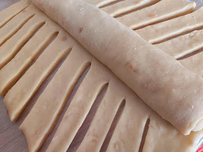 Στη συνέχεια, ανοιξτε το μεγαλύτερο μέρος της ζύμης σε ένα ορθογώνιο, το οποίο πρέπει να έχει μήκος 1 cm μακρύτερο από το πρώτο.