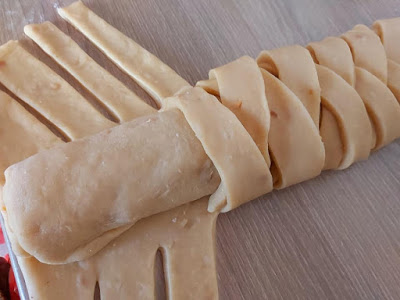 Το γάλα ζεσταίνεται και προστίθεται ζάχαρη, ανακατεύοντας μέχρι να λιώσει. Σε ένα μεγάλο μπολ κοσκινίστε 500 γραμμάρια αλεύρι, φτιάξτε ένα πηγάδι σε αυτό και ρίξτε το γάλα με ζάχαρη, ξηρή μαγιά, αλάτι, ζάχαρη βανίλιας, ξύσμα πορτοκαλιού, χτυπημένα αυγά, ανάμεικτο λιωμενο βούτυρο και λάδι. Όταν ζυμώνετε τη ζύμη, προσθέστε σταδιακά