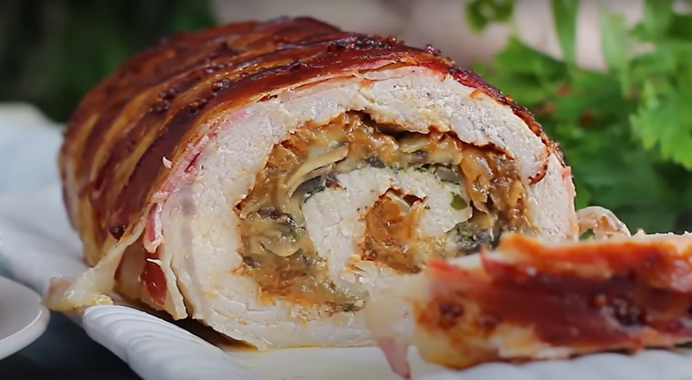 Τυλίγουμε το φιλέτο σε ρολό και τυλίγουμε το ρολό με τις φέτες μπέικον.