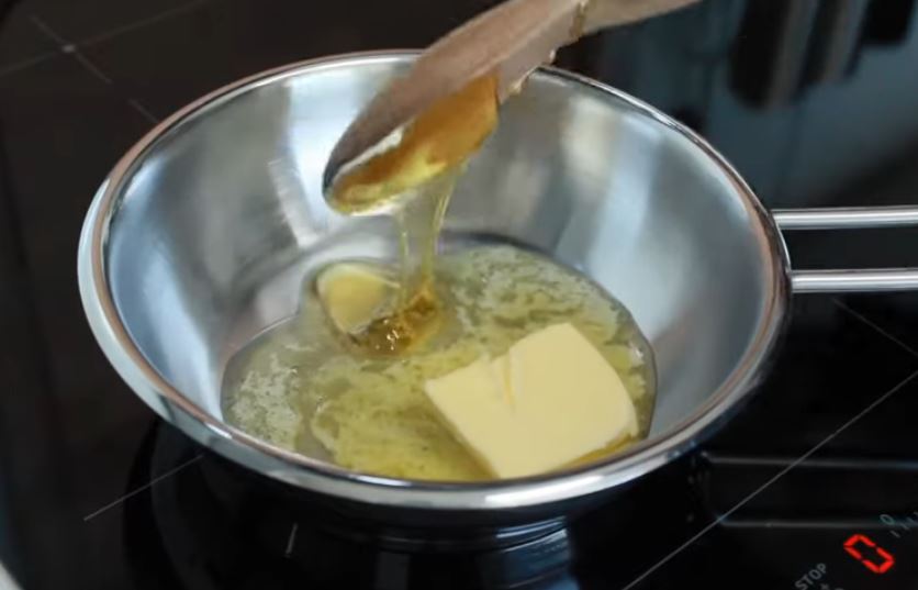 Σε ένα κατσαρολάκι σε μέτρια φωτιά προσθέτω 1 κουταλιά της σούπας βούτυρο και 1 κουταλιά της σούπας μέλι και τα ανακατεύουμε να λιώσουν μαζι σε μία σάλτσα.