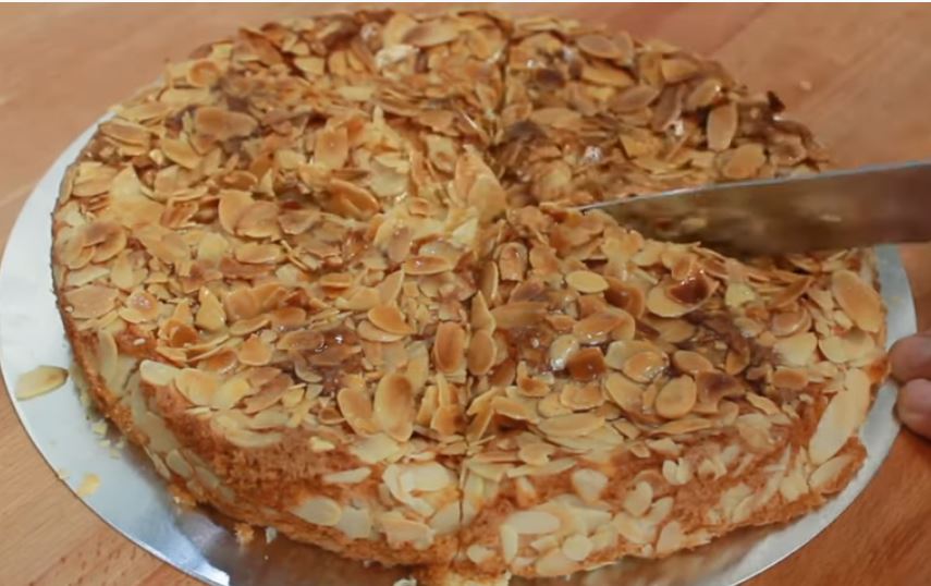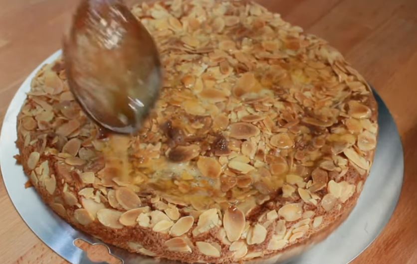 Απλώστε την σάλτσα στο πάνω μέρος του κέικ με τα αμύγδαλα.