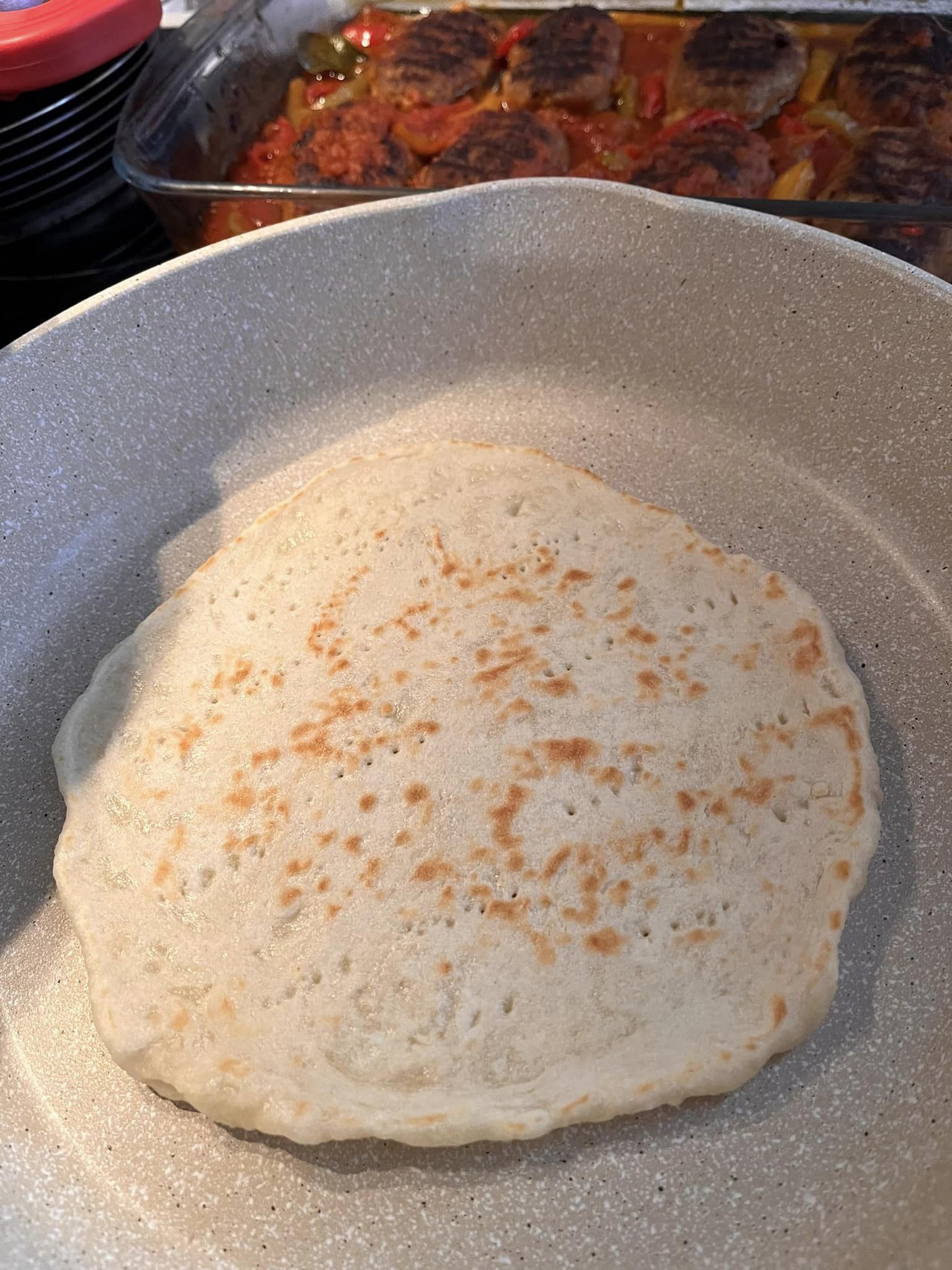 Την αφησα κ φούσκωσε , την ξανα ζύμωσα , την μοίρασα σε 10 μπαλάκια που τα άνοιξα με λαδακι, τα τηγανησα κ τα σκέπασα με πετσετα για να μείνουν μαλακα. Εγώ έψησα της πιτουλες στο τηγάνι χωρις λαδακι .