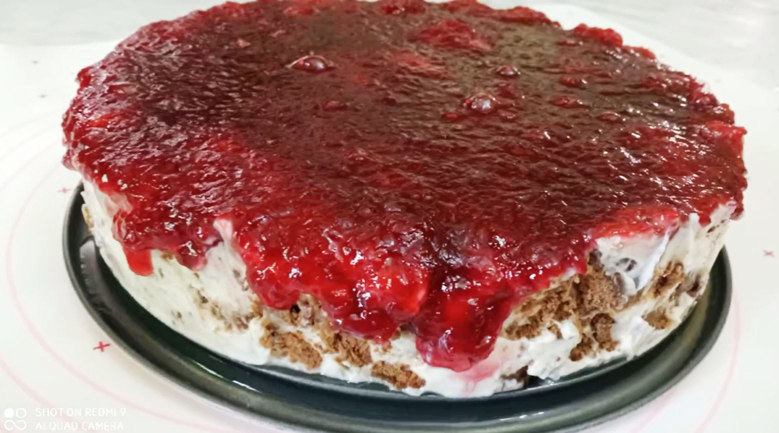 Ρίχνω τα μπισκότα μέσα στο μείγμα με το γιαούρτι και κάνω ένα καλό ανακάτεμα. Ρίχνω το μείγμα μέσα σε ένα τσέρκι και το ισιώνω με μια μαρίζ. Απλώνω μια στρώση μαρμελάδας φράουλας πάνω από το μείγμα.