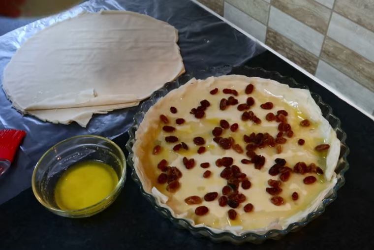 Αλείφουμε με βούτυρο τα φύλλα από πάνω καλά προσθέτουμε τις σταφίδες