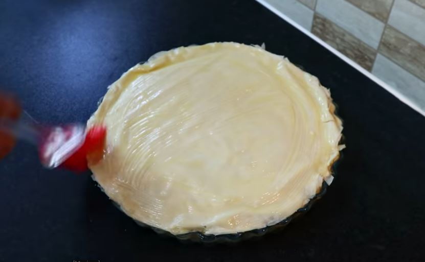 Στο τέλος στρώνουμε και την τελευταία στρώση των φύλλων αλείφουμε με βούτυρο και με την κρέμα που κρατήσαμε προηγουμένως.