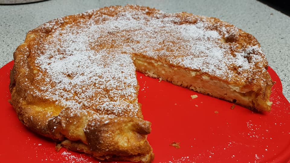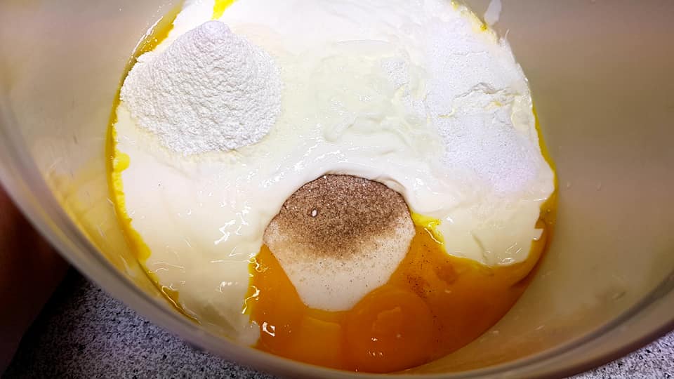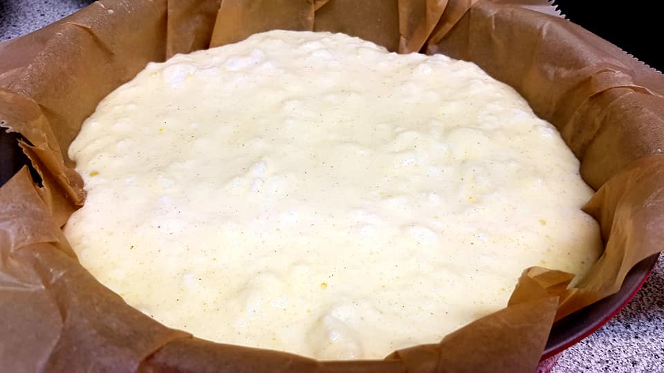 Ρίχνουμε μέσα την μαρέγκα και τ ανακατεύουμε με μια κουτάλα προσεχτικά. Το βάζουμε σε φόρμα 18×18 (Εγώ το έβαλα σε στρογγυλή 26′ κι έτσι έγινε η γιαουρτοπιτα λίγο πιο ψιλή στο πάχος)