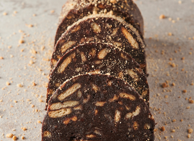 Θρυμματίζουμε με τα χέρια τα μπισκότα σε κομματάκια. Σε μικρό μπολ χτυπάμε ελαφρώς με πιρούνι το αυγό. Σε κατσαρολάκι λιώνουμε το βούτυρο, σε χαμηλή φωτιά. Το ρίχνουμε σε μεγάλο μπολ και προσθέτουμε τη ζάχαρη άχνη, το αυγό, το κακάο και το κονιάκ. Ανακατεύουμε καλά με ξύλινη κουτάλα μέχρι να ομογενοποιηθούν τα υλικά. Προσθέτουμε τα θρυμματισμένα μπισκότα και ανακατεύουμε απαλά με την κουτάλα, ώστε να σκορπιστούν τα μπισκότα στο μείγμα. Σε ταψί στρωμένο με λαδόκολλα αδειάζουμε το μείγμα στο κέντρο και κατά μήκος, σχηματίζοντας μια στήλη. Με τα χέρια τυλίγουμε σφιχτά τη λαδόκολλα γύρω από το μείγμα σε κυλινδρικό σχήμα. Στρίβουμε τις δύο άκρες της λαδόκολλας ώστε να μένουν σταθερές. Αφήνουμε στο ψυγείο για 2 ώρες, ώσπου να σφίξει. Σερβίρουμε κρύο, ξετυλίγοντας τη λαδόκολλα και κόβοντας σε φέτες. Εάν θέλουμε πασπαλίζουμε με τριμμένο αμύγδαλο σκόνη