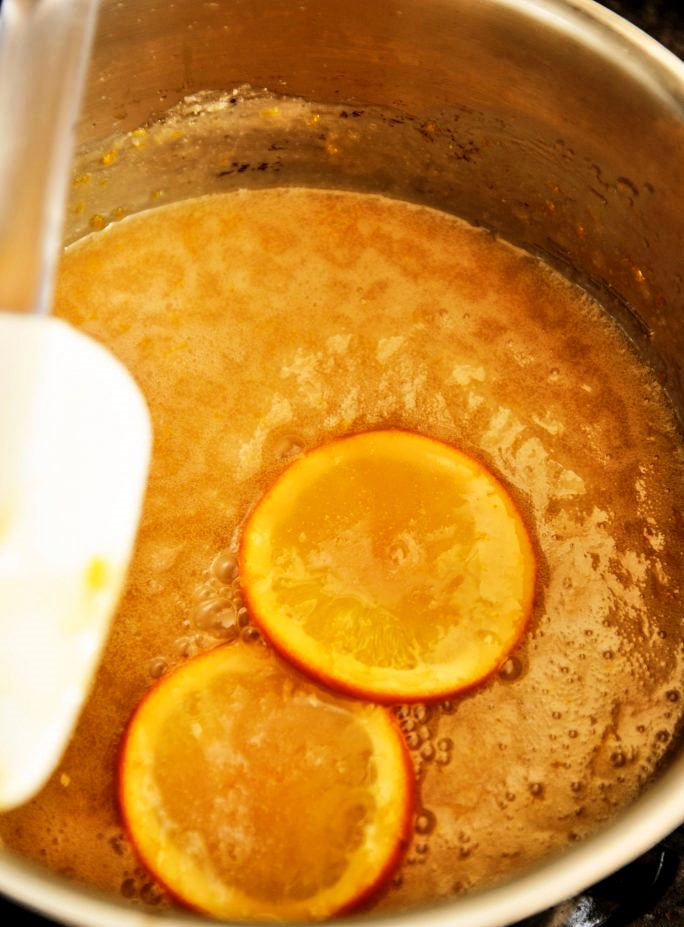 Σιγοβράστε μερικές από τις φέτες πορτοκαλιού στο σιρόπι για ένα λεπτό για να πάρει γεύση η σάλτσα και στη συνέχεια αφαιρέστε τα γρήγορα πριν διαλυθούν.