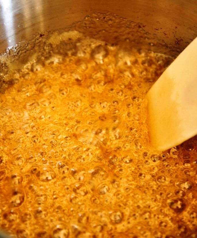 Ανακατεύετε την καστανή ζάχαρη και τη κρέμα γάλακτος και σιγοβράστε για άλλα 2 λεπτά.