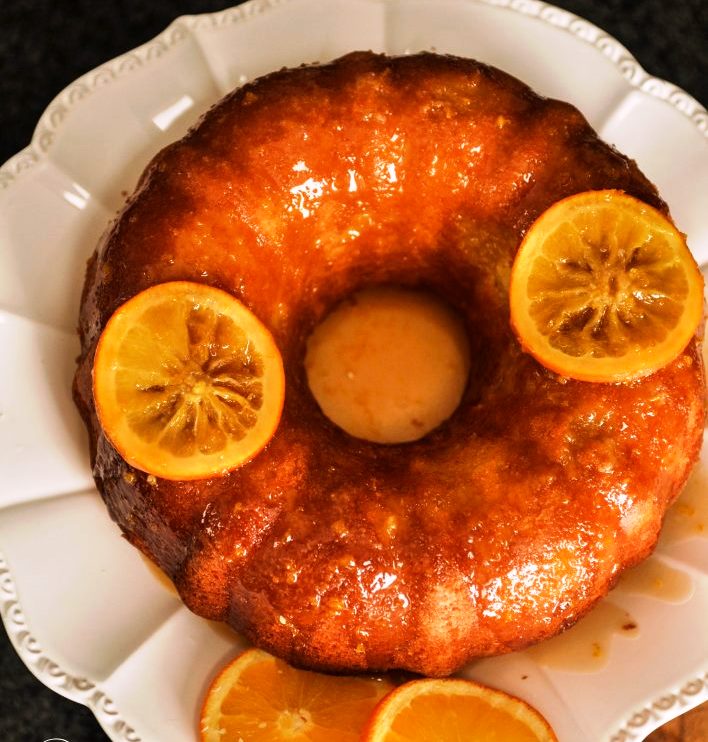 Αφού το κέικ κρυώσει αρκετά, αναποδογυρίστε σε μια πιατέλα/ Τοποθετήστε τις φέτες πορτοκαλιού γύρω από το κέικ και ρίξτε το γλάσσο παντού.