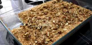 Αδειαζουμε το μείγμα στο μεγάλο ταψί της κουζίνας όπου έχουμε στρώσει μία λαδόκολλα απλώνουμε ομοιόμορφα και ψήνουμε σε προθερμασμένο