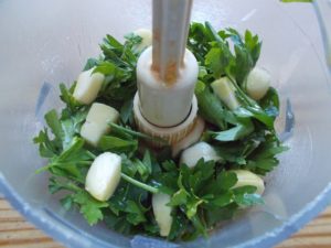 - Βάζω στο μούλτι τα φυλλαράκια του μαϊντανού με καθαρισμένες τις σκελίδες του σκόρδου. Προσθέτω 2-3 κ.σ. ελαιόλαδο και χτυπάω καλά.