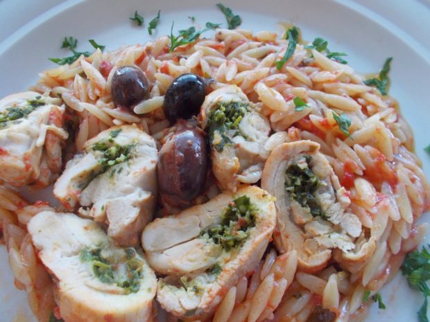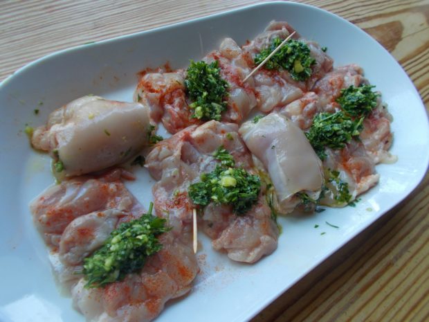 - Προσεχτικά βάζω σχεδόν από μια κ.σ. σε κάθε φιλετάκι, αφού προηγουμένως το έχω αλατίσει και το έχω πασπαλίσει με τις πάπρικες. Το ρολάρω καλά και το στερεώνω με την οδοντογλυφίδα. Μία είναι αρκετή.