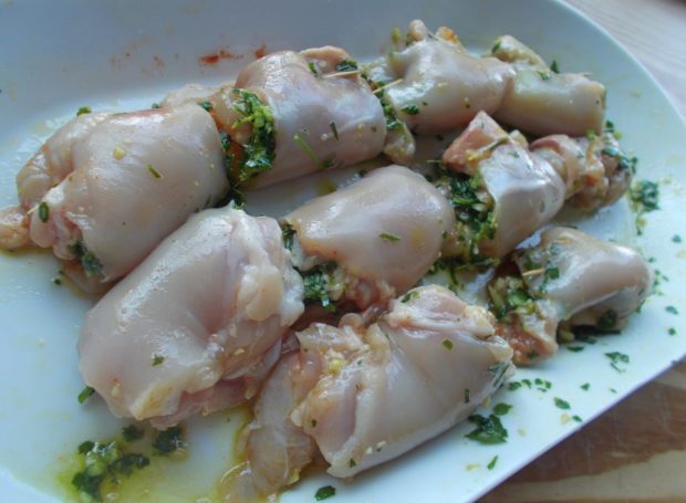 - Απλώνω όλα τα φιλετάκια ανοιχτά σε μια μεγάλη πιατέλα. Αυτό είναι πολύ πρακτικό και χρήσιμο, γιατί έτσι θα μοιραστεί σωστά όλο το μείγμα του μαϊντανού, αλλά και γιατί ό,τι ζουμιά χυθούν στην πιατέλα θα τα ρίξω στη σάλτσα ντομάτας.