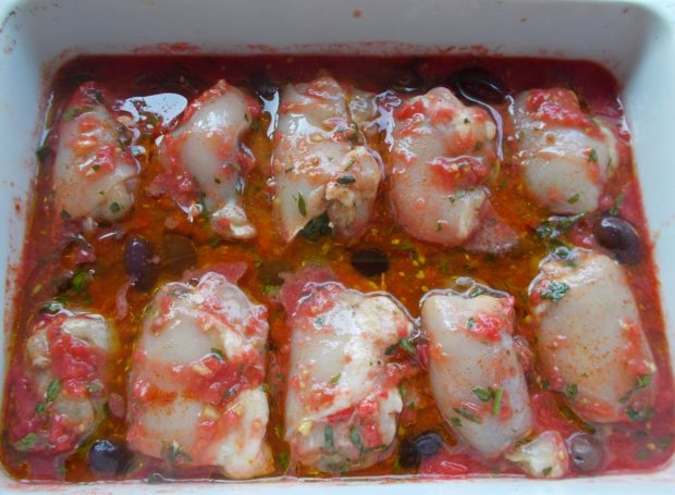 - Ρίχνω τη σάλτσα ντομάτας σε πυρέξ ή ταψάκι, ρίχνω ότι ζουμιά έβγαλαν τα φιλετάκια στην πιατέλα, αλατοπιπερώνω ελαφρά, βάζω προσεχτικά τα ρολάκια με την οδοντογλυφίδα προς τα κάτω στο ταψάκι και σκορπάω τις ελιές ανάμεσα τους. Ρίχνω και αρκετό ελαιόλαδο.