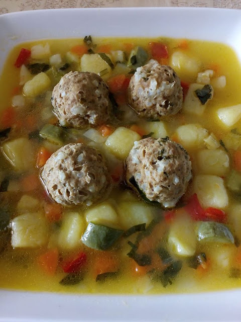Σοταρουμε στο λάδι το κρεμμύδι το πράσο καρότα πατάτες τα κοτσάνια του σέλινου πιπεριές κολοκυθάκι.Σε άλλη κατσαρόλα βάζουμε αρκετό νερό να βράσει και όταν κοχλάσει βάζουμε τα γιουβαρλάκια ξαφρίζουμε βάζουμε και τα σοταρισμένα λαχανικά αλατοπίπερο σκόνη λαχανικόν βράζουμε για 40 λεπτά λίγο πριν το τέλος βάζουμε και τα φύλλα του σέλινου σερβίρουμε με χυμό λεμόνι.
