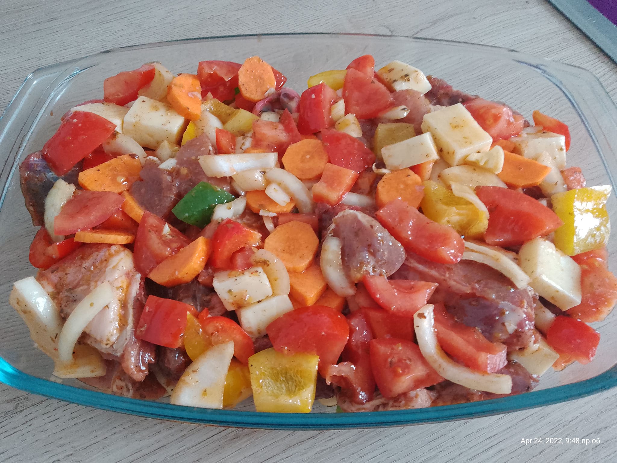 Στη συνέχεια κόψτε τα λαχανικά, το κίτρινο τυρί σε κύβους και ανακατέψτε τα όλα. Ρίχνουμε σε ένα πυρεξ χωρίς καθόλου νερό εκτός από τη μαρινάδα,