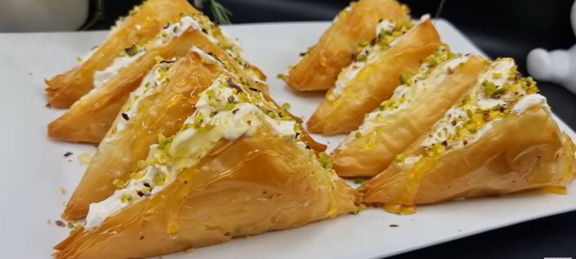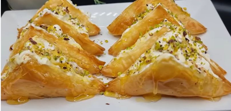 Μετά παίρνουμε τα φύλλα μας τα ανοίγουμε στη μέση και τα γεμίζουμε με κρέμα τα πασπαλίζουμε με τριμμένο φιστίκι Αιγίνης και μέλι απο πάνω και το γλυκάκι μας είναι έτοιμο