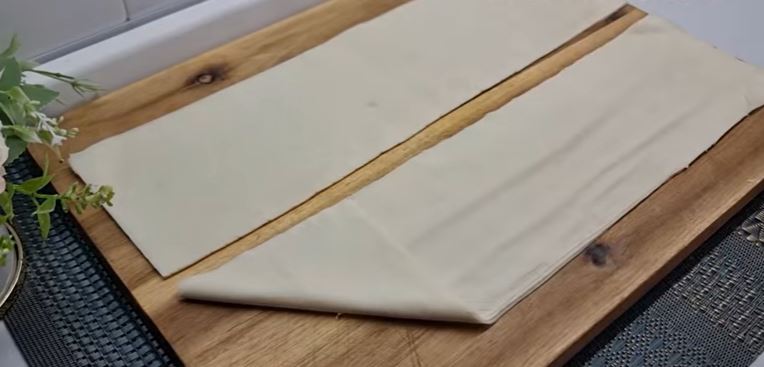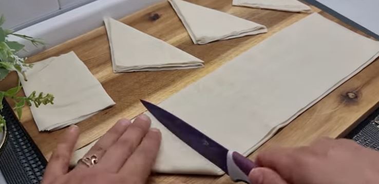 Ανοίγουμε τα φύλλα κρούστας στον πάγκο μας και τα κόβουμε στη μέση παίρνουμε τα μισά φύλλα τα βάζουμε οριζόντια και κόβουμε δύο λωρίδες (περίπου 8-10 εκ) μετά ξεκινάμε πιάνουμε την άκρη της μιας λωρίδας και τη διπλώνουμε στην απέναντι πλευρά όπως κάνουμε στα τρίγωνα. Αλλά μόνο μία φορά και κόβουμε το πρώτο τρίγωνο έτσι συνεχίζουμε μέχρι το τέλος του φύλλου όσα θα βγούνε (με τον ιδιο τρόπο και τα υπόλοιπα φύλλα).