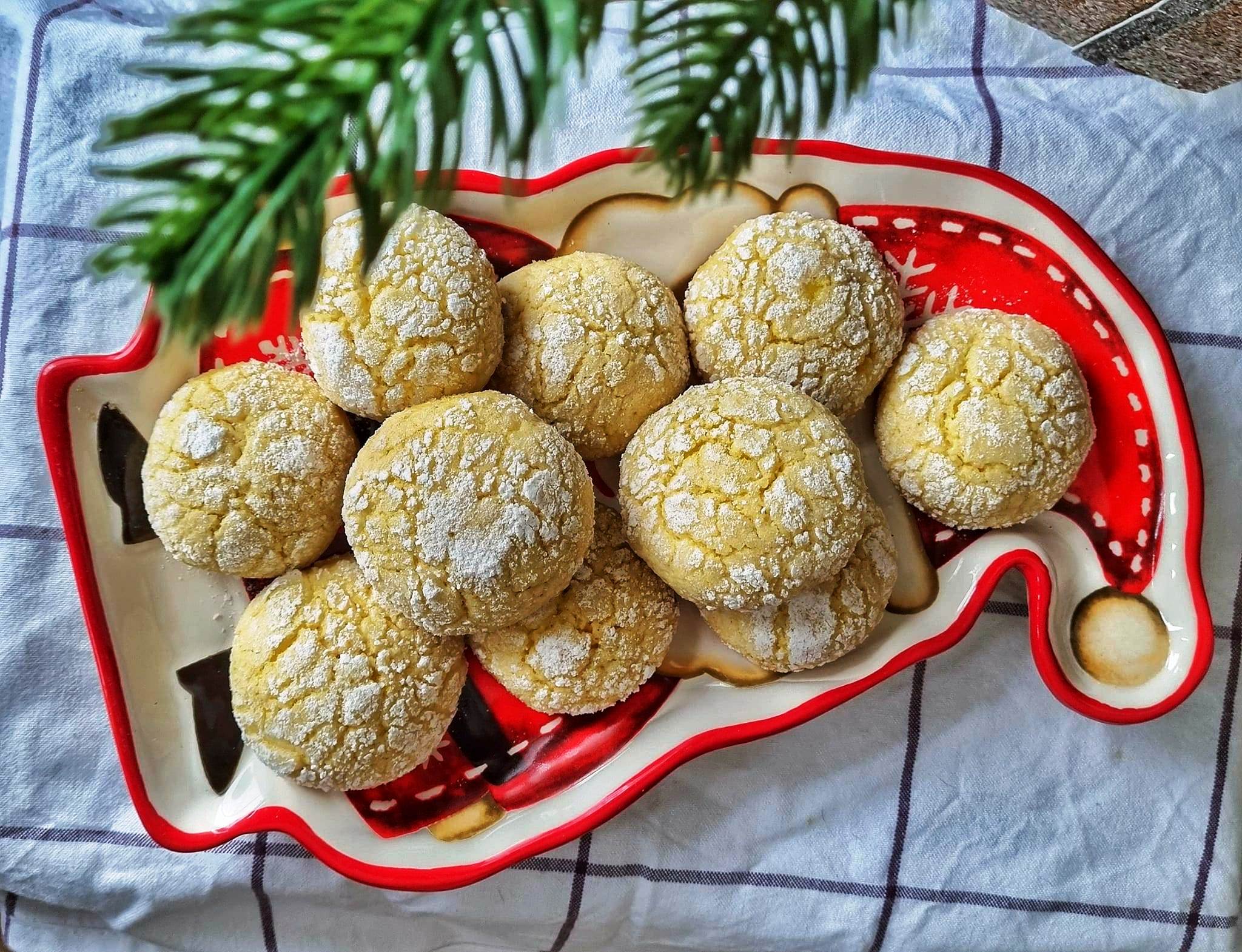 Ανακατεύουμε καλά προσθέτουμε το αλεύρι και το μπέικιν πάουντερ. Ανακατεύουμε όλα με μίξερ όταν γίνουν ένα ομοιογενές μείγμα το βάζουμε στο ψυγείο για 1 ώρα. Πλάθουμε μικρά μπαλάκια τα πιεζουμε λίγο με τις παλάμες και τα ριχνουμεμε σε άχνη ζάχαρη, τσ τοποθετούμε σε ένα ταψί στρωμένο με λαδόκολα και και ψήνουμε στους 180C για 15 λεπτά.