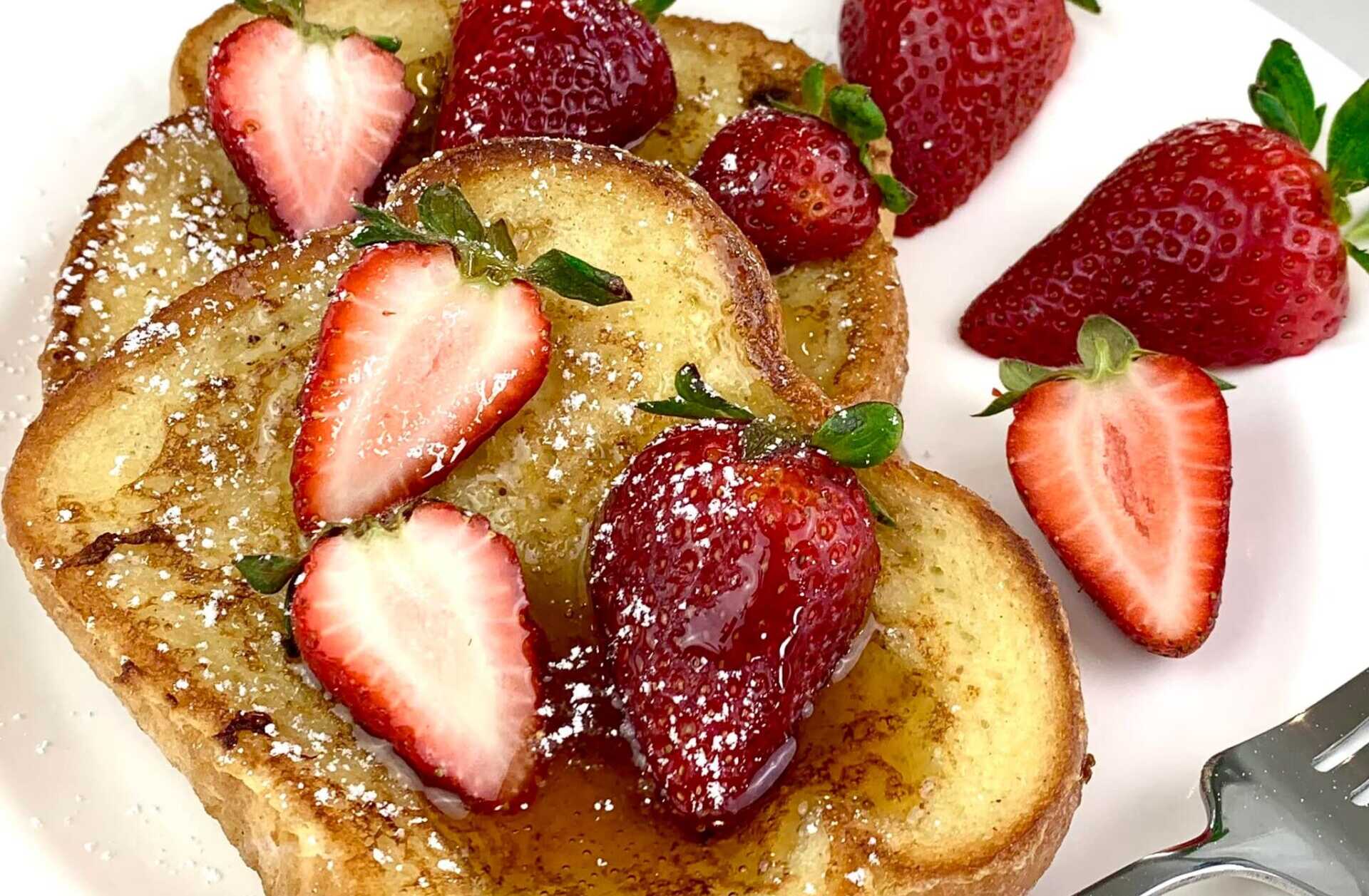 Γυρίστε το ψωμί επίπεδο και από τις δύο πλευρές και επαναλάβετε τη διαδικασία για την ποσότητα του ψωμιού του τοστ που είναι διαθέσιμη. Αφού το βάλετε στο πιάτο του σερβιρίσματος, προσθέστε φράουλες, σιρόπι σφενδάμου, ζάχαρη άχνη και απολαύστε.
