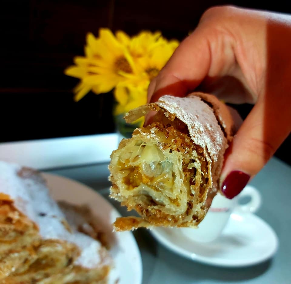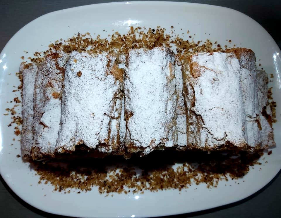 δ) Στη συνέχεια τυλίγουμε το ρολό μέχρι το τέλος . Το τελειωμένο ρολό έχει έναν μαλακό πυρήνα κολοκύθας στη μέση, που απομονώνεται από πολλά στρώματα φύλλου, και γύρω του υπάρχει γέμιση καρυδιού-κανέλας με ζάχαρη.