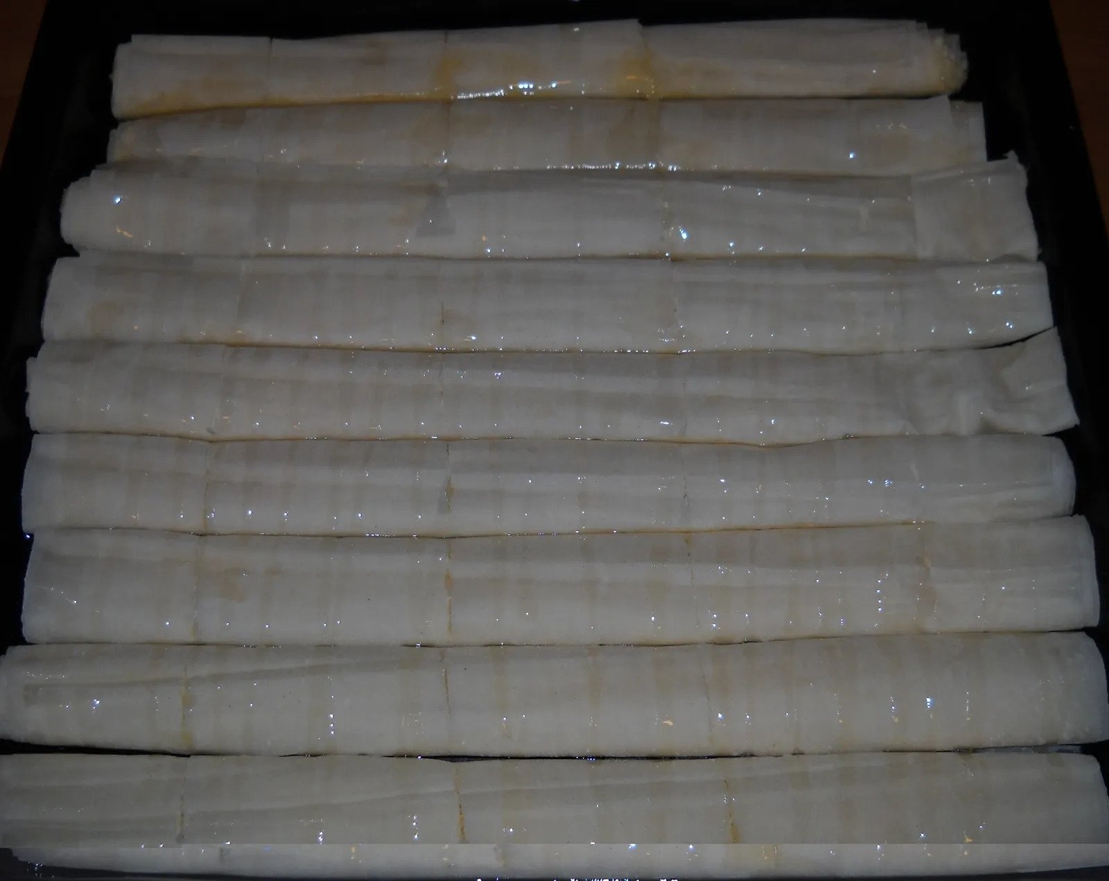 Αραδιάζουμε τα ρολά σε ένα μεγάλο ταψί αλειμμένο με λάδι. Επαναλάβετε τη διαδικασία μέχρι να εξαντληθούν τα υλικά.