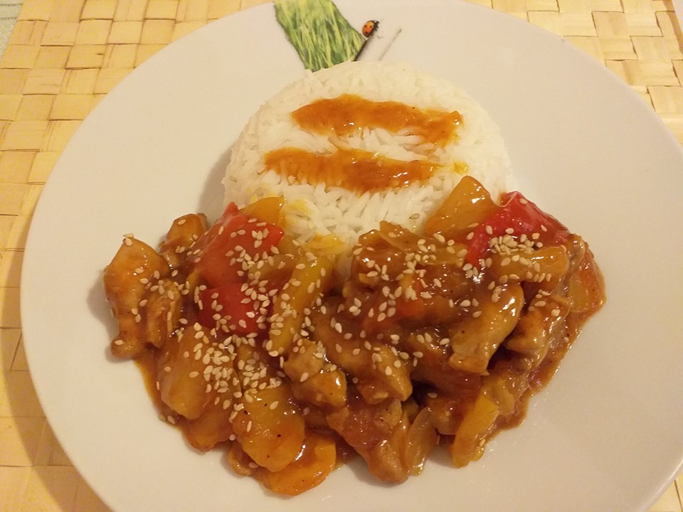 Βαζουμε το κοτόπουλο σε μπολ με σάλτσας σόγιας μέχρι να το καλύψει, το αφήνουμε για τουλάχιστον 1 ωρα στο ψυγείο.                                                                      Ετοιμάζουμε τα λαχανικά με τον ανανά βάζουμε να ζεσταθεί το λάδι τα ρίχνουμε με λίγο αλάτι και πιπέρι, ανακατεύουμε χαμηλώνουμε θερμοκρασία & μαγειρεύουμε για 1/2 ωρα περίπου.                                                                                                              Βάζουμε σε αντικολητικό τηγάνι λίγο σογέλαιο, ρίχνουμε το κοτόπουλο όπως είναι με την σάλτσα, βάζουμε λίγο αλάτι & πιπέρι ανακατεύουμε σε μέτρια φωτιά, μόλις γίνει το ρίχνουμε στα λαχανικά.                                                                                                        Εχουμε ετοιμάσει σε μπωλ 1/2 φλ,σάλτσα σόγιας 1/4 φλ.χυμό ανανά,1κ.σ.ξύδι άσπρο, 1κ.σ..κέτσαπ, 1κ.γλ.πελτέ ντομάτας,λίιγο φρέσκο τζίτζερ τριμενο ή λίγο σκόνη, 1κ.σ.καστανη ζάχαρη, ανακατεύουμε και τα ρίχνουμε μαζί με το κοτόπουλο, μαγειρεύουμε για 10′.Εχουμε ετοιμάσει 2κ.σ.κορν φλάουερ διαλυμένο σε λίγο νερό, το ρίχουμε στο τέλος μαγειρεύουμε για 2-3΄σε χαμηλή θερμοκρασία.                                                         Συνοδεύω πάντα με ρύζι μπασμάτι, στο οποίο δεν βάζω τίποτα μόνο νερό και γίνεται σαν ατμού, δοσολογία είναι όση ποσότητα είναι το ρύζι διπλάσιο νερό, όχι σε γραμμάρια, σε ποσότητα που την μετράω σε 2 ίδια ποτήρια.Αφού έρθει στην μέγιστη θερμοκρασία βρασμού το νερό ρίχνω το ρύζι, μόλις ανέβει η θερμοκρασία, το γυρίζω λίγο πριν να κλείσει το μάτι και μαγειρεύω για 30΄                        Οταν σερβίρω ρίχνω πάνω απο το φαγητό σουσάμι (αναποφλοίωτο χρησιμοποιώ) Άν το φτιάξετε βάλτε και λίγη πράσινη πιπεριά, εγώ πάντα βάζω τώρα δεν είχα.Μην σας φαίνεται δύσκολη η συνταγή είναι πολύ εύκολη, γρήγορη και υγιεινή.                                                Καλή επιτυχία σε όσους το φτιάξουν