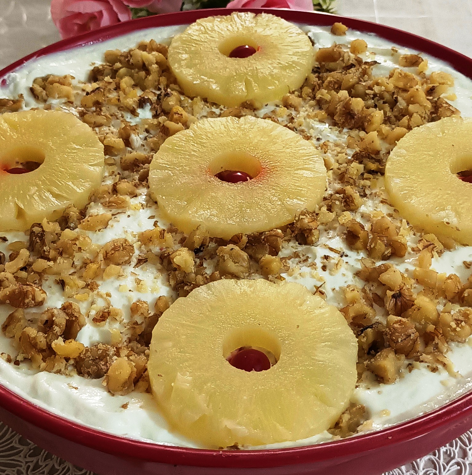 Ενα ταψί με δροσερό γλυκό γιαούρτι με κομματάκια ανανά, πασπαλισμένο με καρύδια, έτοιμο για σερβίρισμα.