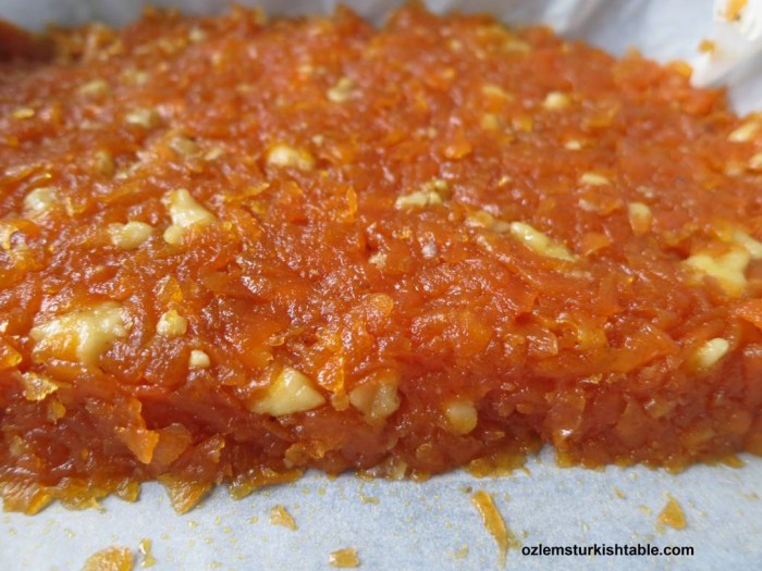 - Απλώστε την πάστα καρότου ομοιόμορφα και σφιχτά, σχηματίζοντας ένα στρωμα, με ύψος 1,5 εκ .