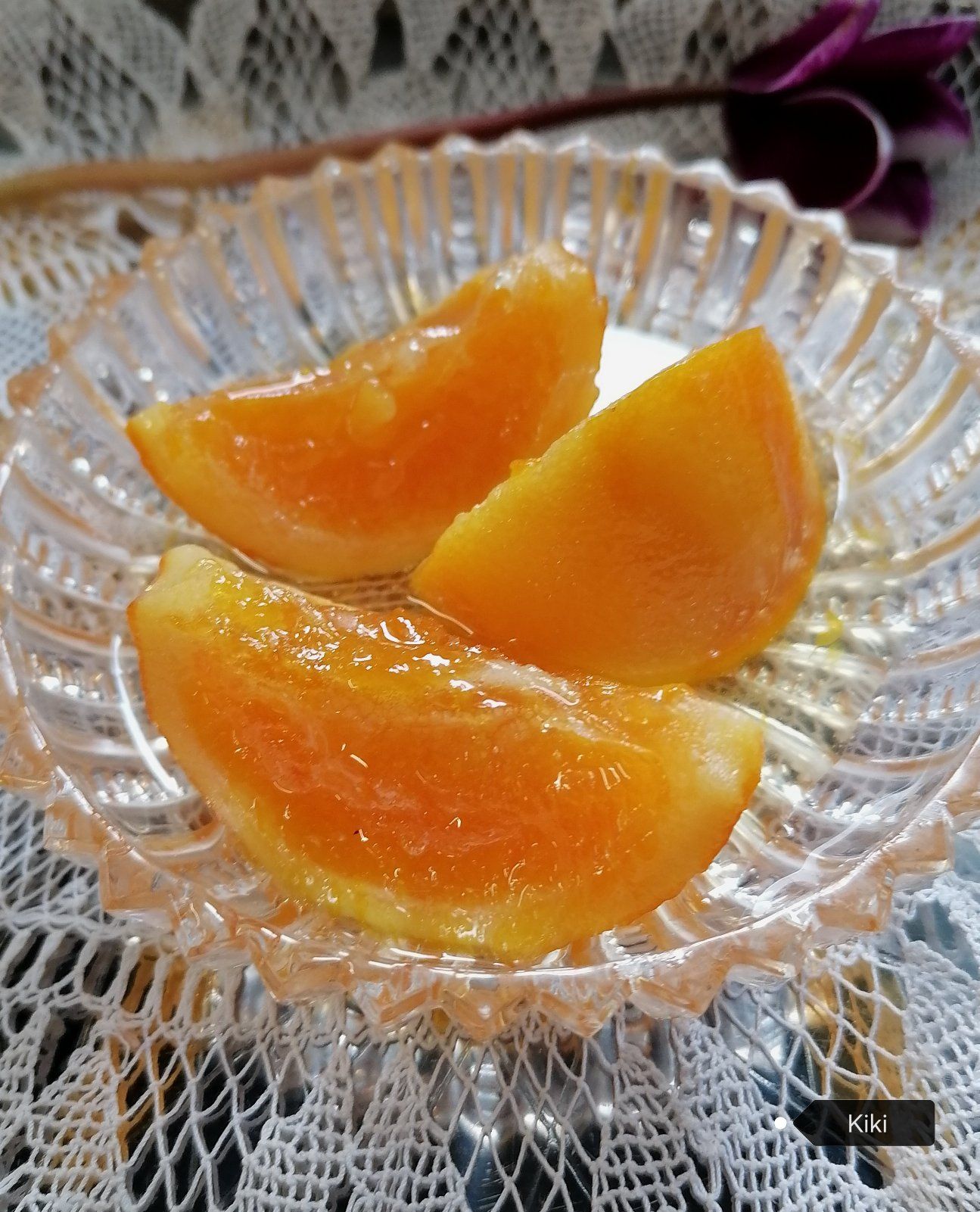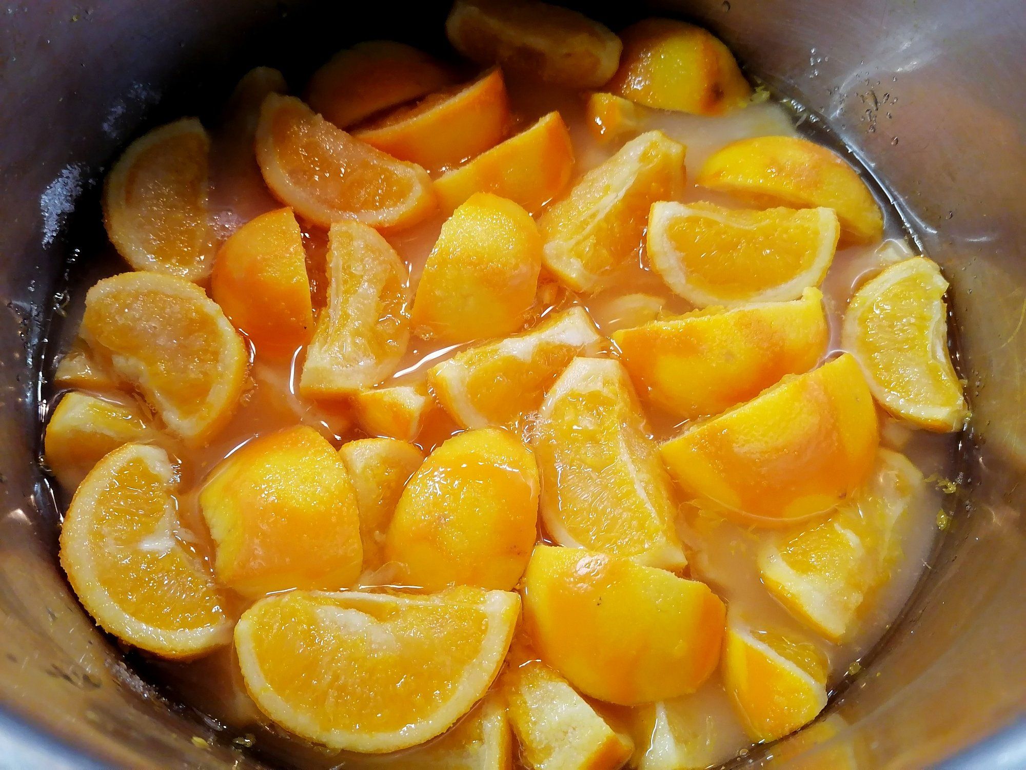 Αφού στεγνώσουν καλά τα κόβουμε σε χοντρές φέτες. Καθαρίζουμε προσεκτικά τις μεμβράνες με ένα ψαλίδι κουζίνας. Αραδιάζουμε τις φέτες σε δύο στρώσεις στην κατσαρόλα και τις καλύπτουμε με τη ζάχαρη και το χλιαρό νερό. Τις αφήνουμε για 3 ώρες να βγάλουν τα δικά τους φυσικά ζουμάκια