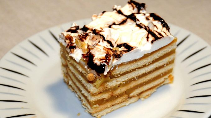 Σε μια κατσαρόλα βάζουμε τα 800 γρ χυμό μήλο και το βάζουμε στην φωτιά. Σε μπολ ρίχνουμε τα 200 γρ χυμό και 7 κουταλιές της σούπας κορν φλαουρ. Το ανακατεύουμε να διαλυθεί και το προσθέτουμε στην κατσαρόλα με τον χυμό. Το ανακατεύουμε συνέχεια μέχρι να πήξει. Σε ένα άλλο μπολ βάζουμε τα άλλα 200 γρ χυμό όπου θα βουτήξουμε τα μπισκότα. Σε ένα μακρόστενο ή τετράγωνο πυρέξ βάζουμε με τη σειρά τα μπισκότα που έχουμε περάσει από τον χυμό. Βάζουμε μια στρώση μπισκότα μια στρώση από τον χυμό που κάναμε κρέμα, και συνεχίζουμε εναλλάξ για 5 στρώσεις, και τελειώνουμε τελευταία στρώση με την κρέμα ροδάκινου.