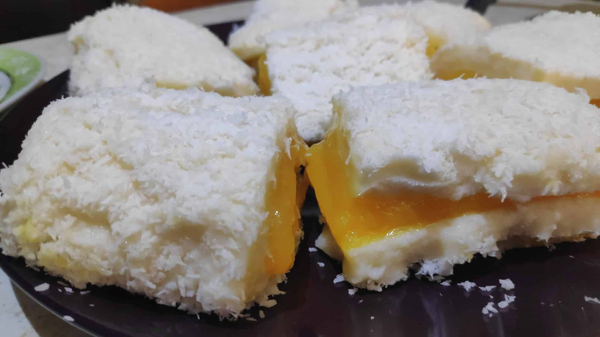 Παίρνουμε ένα ορθογώνιο ταψί το βουτυρώνουμε καλά σε όλη την επιφάνεια και απλώνουμε παντού τις νιφάδες καρύδας ώστε να καλυφθεί ο πάτος Ρίχνουμε προσεκτικά από πάνω την καυτή λευκή κρέμα και την ισιώνουμε με μια σπάτουλα Τοποθετούμε το ταψί στο ψυγείο για 2 ώρες να σταθεροποιηθεί