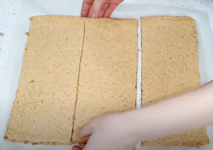 Αδειάζουμε το μείγμα σε ένα ταψί στρωμένο με χαρτι ψησίματος και το απλώνουμε σε λεπτό στρώμα και ψήνουμε στους 180 βαθμούς για περισσότερα απο 15 λεπτά.