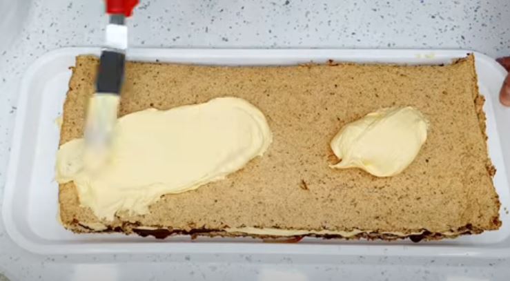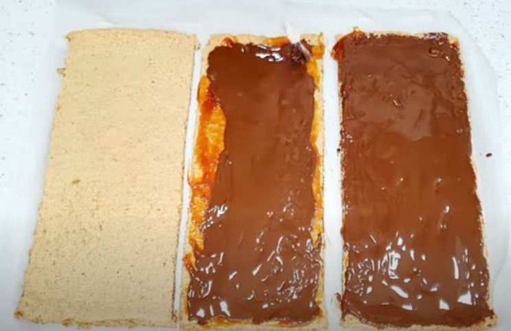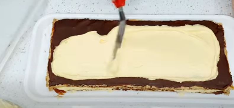 Μόλις κρυώσει την απλώνουμε πάνω από την καραμέλα στις 2 βάσεις μπισκότου και αφήνουμε στην άκρη.