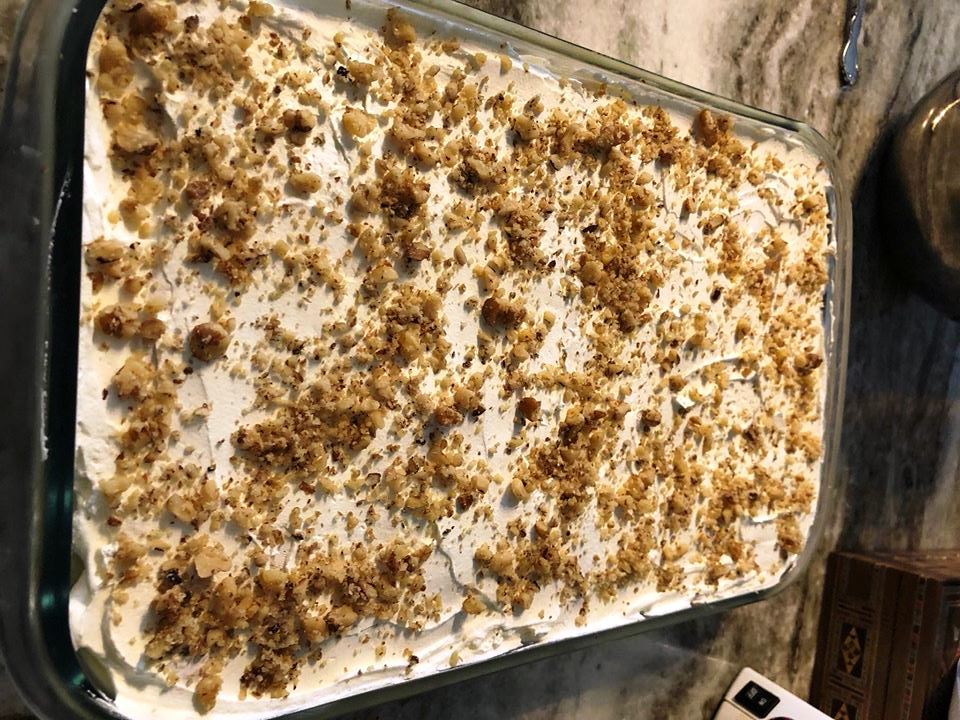 Απλώστε την κρέμα σαντιγί (μορφατ) από πάνω και πασπαλίστε τα καρύδια και την τριμμένη σοκολάτα απο πάνω