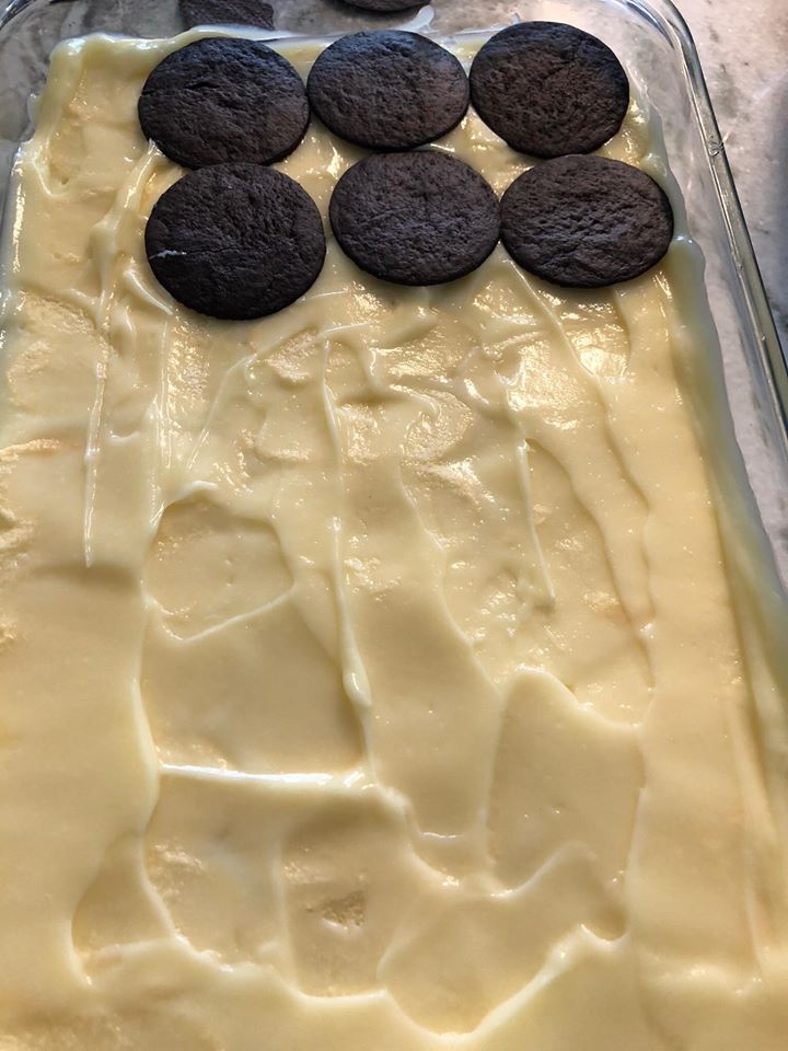Απλώστε το υπόλοιπο της πουτίγκας πάνω από τα μπισκότα
