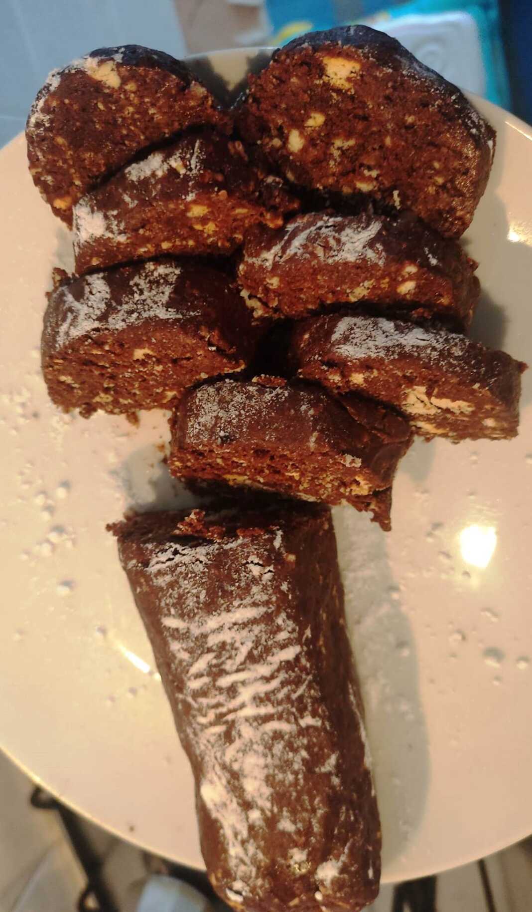 Σχημάτισα ένα σαλάμι και το βάζω στην κατάψυξη για μια ώρα, μετά στο ψυγείο για 1 ώρα επειδή έπρεπε να το σερβίρω στο μεσημεριανό τραπέζι, μπορείτε να το αφήσετε περισσότερο αν θέλετε, πασπαλίζω με ζάχαρη και το σερβίρω.