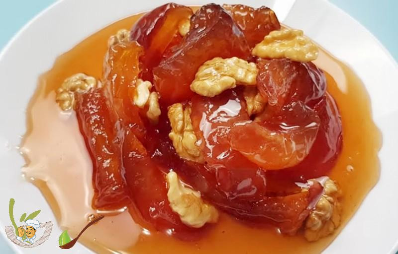 περισσότερο από μισή ώρα. Στο τέλος του μαγειρέματος προσθέτουμε τα καρύδια χωρισμένα σε τέταρτα.