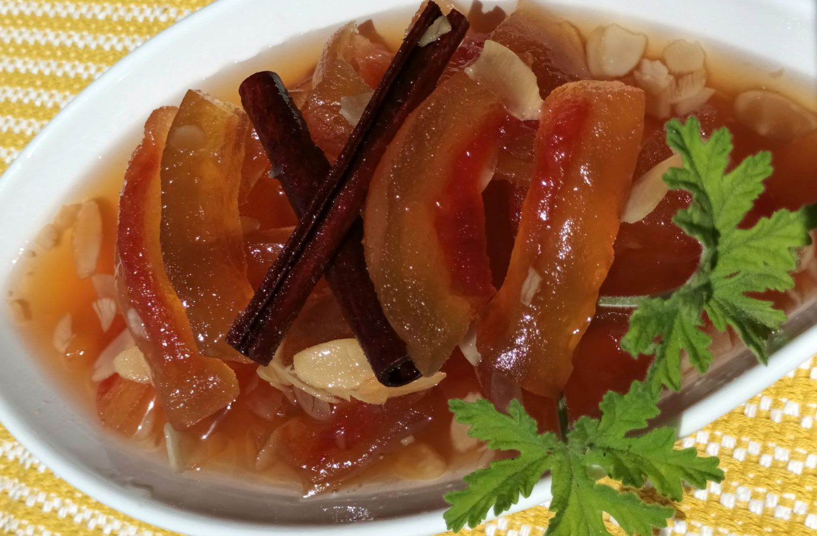 Καθάρισα την πράσινη φλούδα από το καρπούζι και το έκοψα σε χοντρά μπαστούνια, αφήνοντας λίγο από την κόκκινη σάρκα του. Τα ζύγισα και τα έβαλα σε μια λεκάνη με νερό και χυμό από λεμόνια, και τα άφησα στο ψυγείο για 4-5 ώρες. Τα στράγγιξα και τα έβαλα σε κατσαρόλα.