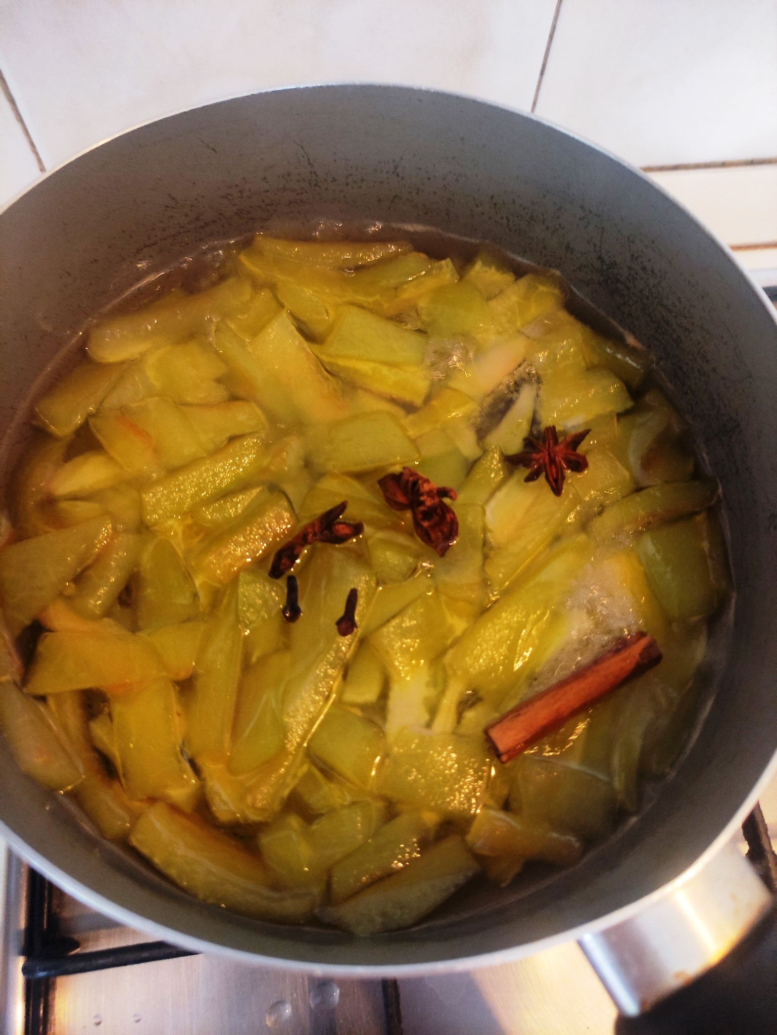 - Προσθέτω τη φλούδα του καρπουζιού και τα αρωματικά: τα γαρίφαλα, τα αστεράκια γλυκάνισου και το ξυλάκι κανέλας.