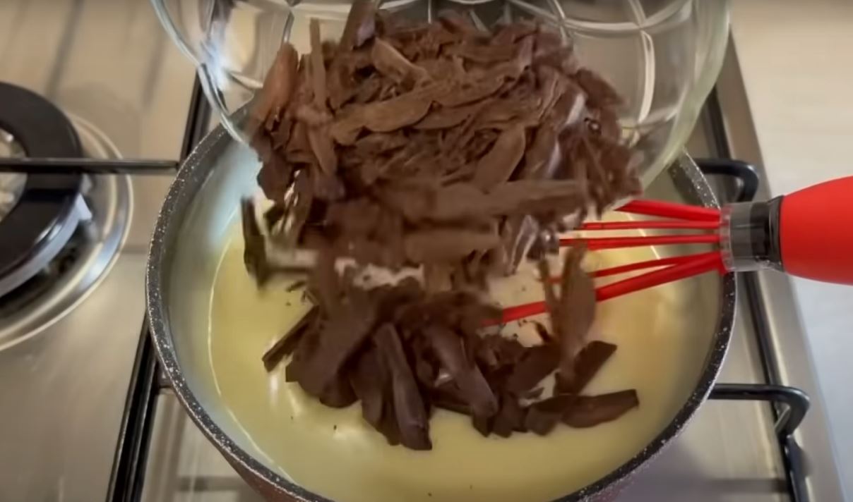 Ρίχνουμε το γάλα και βάζουμε την κατσαρόλα σε χαμηλή φωτιά μέχρι να δέσει η κρέμα. Προσθέτουμε την σοκολάτα και ανακατεύουμε να λιώσει.