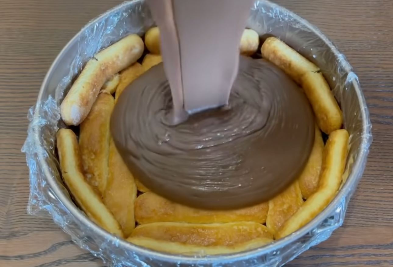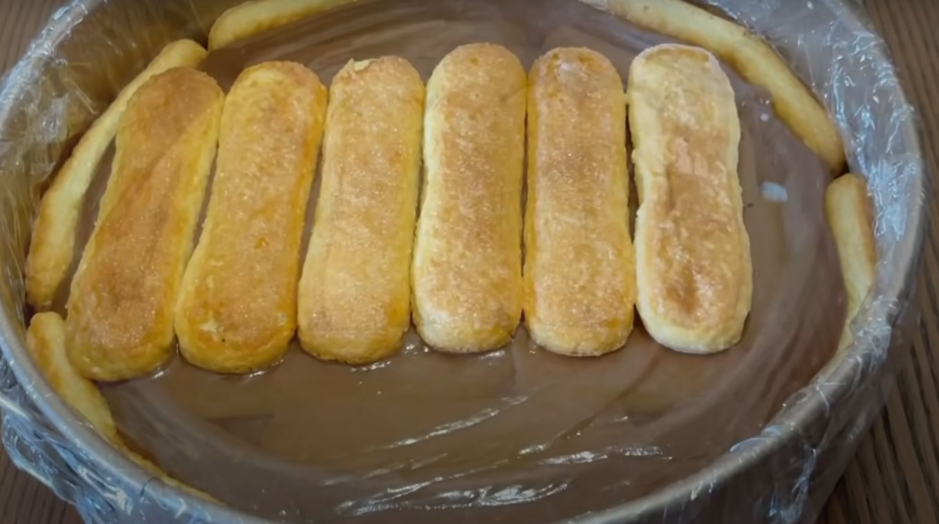 Σε μια φόρμα 24 εκ. βάζουμε διάφανη μεμβράνη και στρώνουμε στο πάτο μία στρώση σαβουαγιάρ αφού τα μουλιάσουμε στο γάλα.