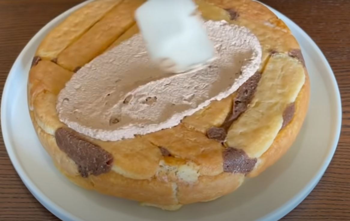 Βάζουμε και στα τοιχώματα της φόρμας γύρω γύρω σαβουαγιάρ. Ρίχνουμε την κρέμα.