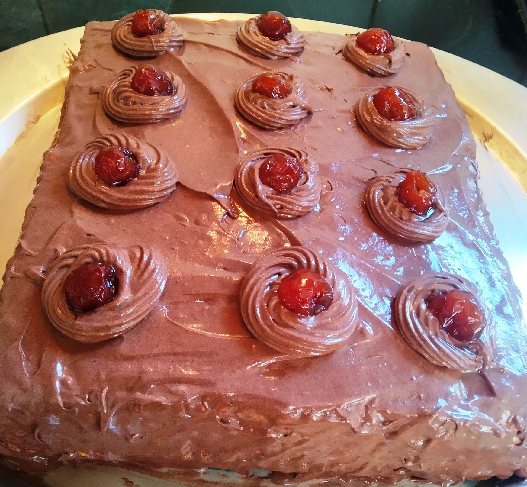 Τέλος, κάνουμε ροζέτες με την σοκολατένια κρέμα που μας περίσσεψε και γαρνίρουμε με κερασάκια. Βάζουμε το γλυκό στο ψυγείο και μετά από μία ώρα είναι έτοιμο για σερβίρισμα.
