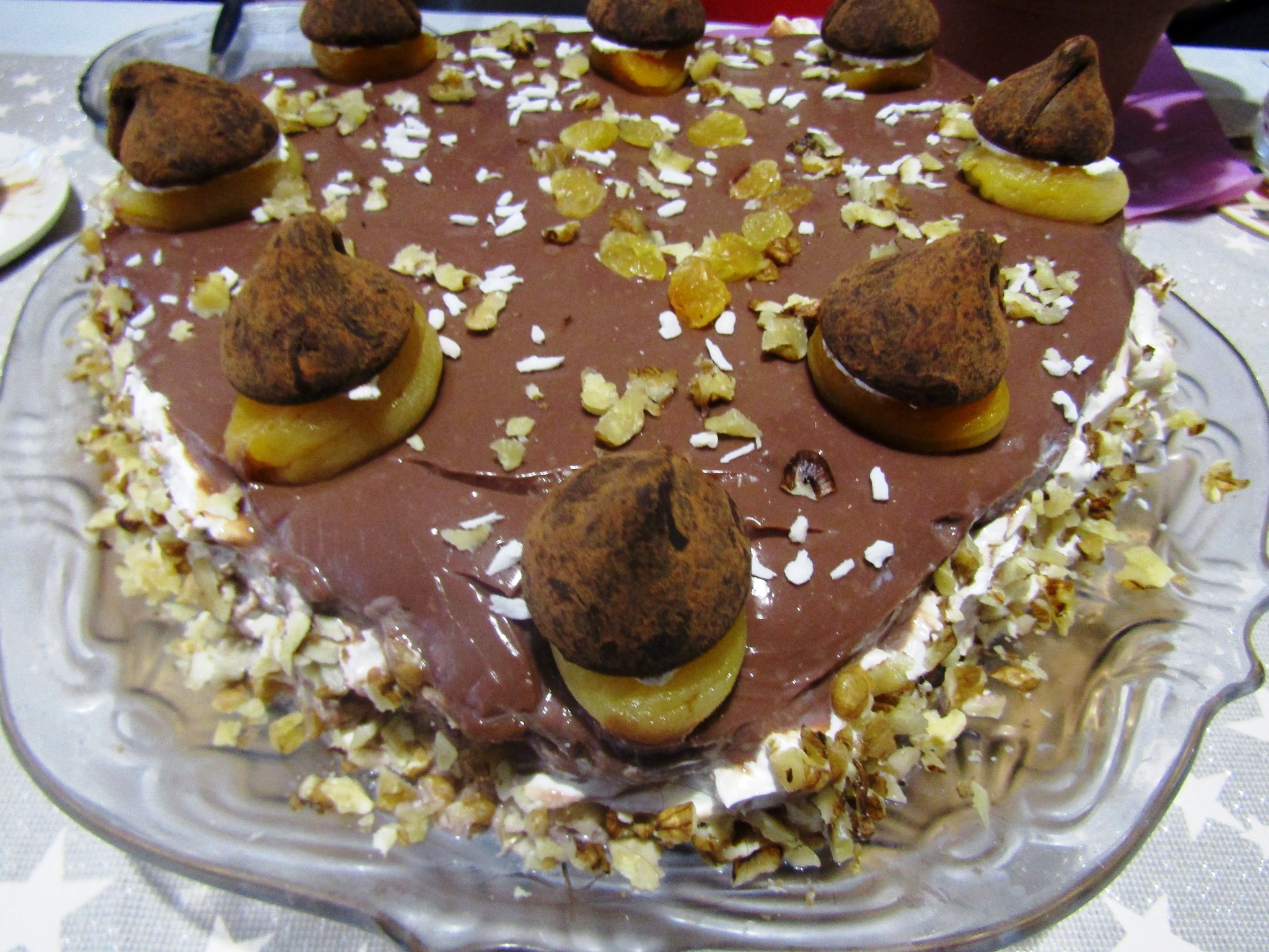 Αφού δέσει η πουτίγκα, διακοσμώ με αποξηραμένα βερίκοκα, ψιλοκομμένα καρύδια και τρίμματα καρύδας, σταφίδες και καραμέλες «τρούφας» τα κολλαω με την σαντιγι.
