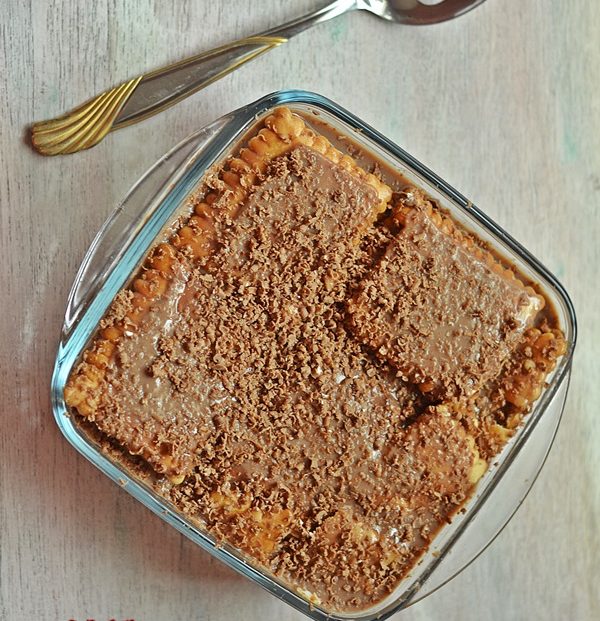 Πάρτε ένα γυάλινο πυρεξ  10×10 εκ , ευθυγραμμίστε στο κάτω μέρος με τα μπισκότα, αφού τα βυθίσετε στον καφέ.