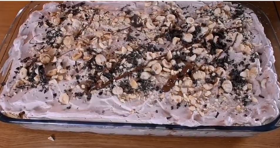 6)Επαναλαμβανουμε την ίδια διαδικασία με τα υπόλοιπα υλικά (μπισκότο – γάλα-κρέμα-φουντούκι, τριμμα σοκολάτας και πραλινα)