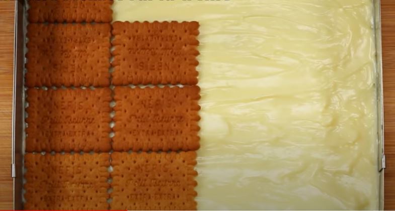 Απλώστε την κρέμα για καλυψετε την βάση με τα μπισκότα , μετά στρώστε από πάνω απο